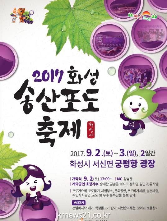 나들이하기 좋은 가을, 다양한 어촌체험도 하고 맛 좋은 포도도 맛볼 수 있는 ‘2017 화성송산포도축제’ 가 오는 9월 2일부터~3일까지 화성시 서신면 궁평항에서 펼쳐진다."고 밝혔다.
