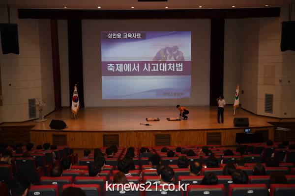 완주군이 성공적인 와일드푸드축제를 위해 전 직원을 대상으로 안전교육을 실시했다. 4일 문예회관에서 진행된 ‘2017 와일드푸드축제 안전관리 교육’에서는 축제에서 많이 다뤄지는 화기 사용에 대한 주의와 소화기(전) 사용법, 축제장에서의 응급처치요령에 대한 교육이 이뤄졌다.