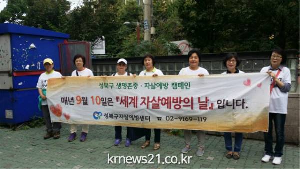 한편 성북구는 고독․굶주림․자살이 없고, 새로운 가족과 아름다운 돌봄이 있는 이른바 ‘3無2有’ 정책을 내걸고, 서울 내 유일하게 지역구 단위의 자살예방센터를 운영해 자살예방사업을 추진하고 있다.