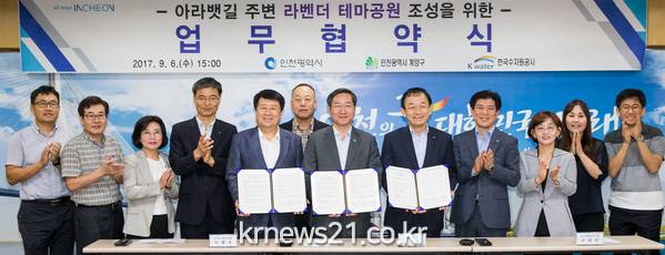 인천 계양구(구청장 박형우)는 6일 인천시청 2층 접견실에서 인천광역시(시장 유정복), 한국수자원공사(사장 이학수)와「아라뱃길 주변 생태공원 테마단지 조성을 위한 업무협약」을 체결했다.