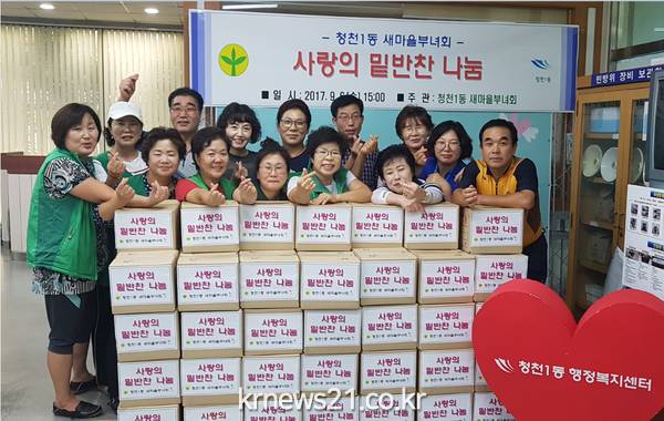 부평구(구청장 홍미영) 청천1동 새마을부녀회(회장 박근자)는 지난 6일 정성을 담아 조리한 밑반찬을 관내 저소득 가정 및 경로당에 지원하는 “사람의 밑반찬 나눔” 행사를 했다."고 밝혔다.
