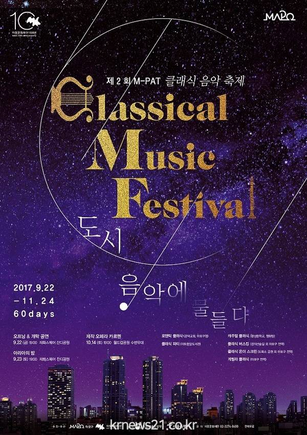 마포구(구청장 박홍섭)과 마포문화재단(대표이사 이창기)에서는 재단 창립 10주년을 맞아 도시 전체가 클래식 음악회장이 되는 신개념 클래식 음악 축제 “M-PAT(Mapo Performing Arts & Tourism) 페스티벌”을 개최한다.
