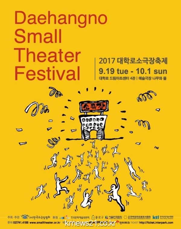 2017년 올해로 11회째를 맞이하는 대학로소극장축제가 9월 18일부터 10월 1일까지 예술극장 나무와 물, 드림아트센터에서 개최된다. 한국소극장협회 주최, 주관하는 대학로소극장축제는 소극장을 중심으로 창작되고 활동하는 저예산, 소규모 공연을 만날 수 있는 무대다.
