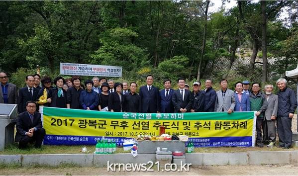 황금연휴 인 추석 다음날인 10월 5일 오전11시 서울특별시 강북구 수유리 애국선열묘소에서 대한민국순국선열 숭모회가 주관하고,글로벌에코넷(김선홍 상임회장),한국정치평론가협회(전대열 회장),독도칙령기념사업국민운동연합(조대용 회장),천지인 산악회(신은선 회장)가 주최하는 무후선열 광복군 17위 추도식 및 추석 합동차례가 엄숙하게 진행됐다.
