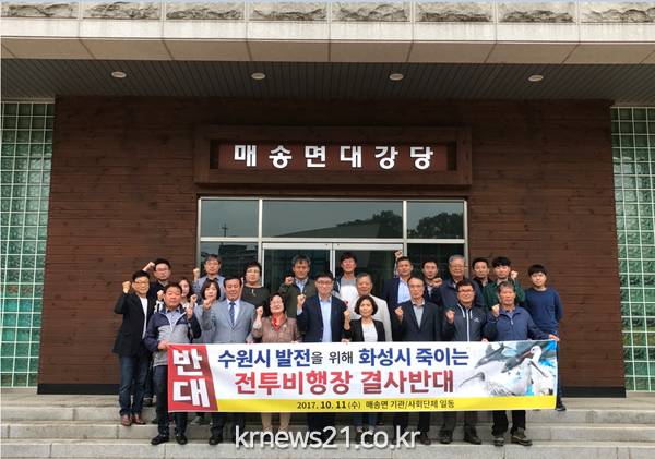 11일 매송면 사무소 앞에서 이장단 협의회 등 24개 기관 · 단체 회원 30여 명이 한 목소리로 수원 전투비행장 화성시 이전을 반대하는 결의대회를 개최했다.