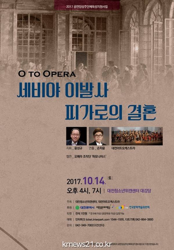 이번 공연은 대전문화재단(대표이사 이춘아)이 진행 중인 2017 공연장상주단체육성지원사업의 하나로 마련됐다. 대전아트오케스트라는 프랑스의 극작가 보마르셰가 쓴 『세비야의 이발사』와 그 후속편인 『피가로의 결혼』을 원작으로 작곡된 두 편의 오페라를 하나로 묶어 새롭게 선보인다.