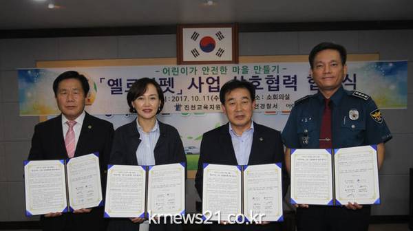 진천군은 지난 11일 군청 소회의실에서 진천교육지원청, 진천경찰서, 초록우산어린이재단과 함께 ‘옐로카펫 사업 상호협력을 위한 협약식’을 개최했다.