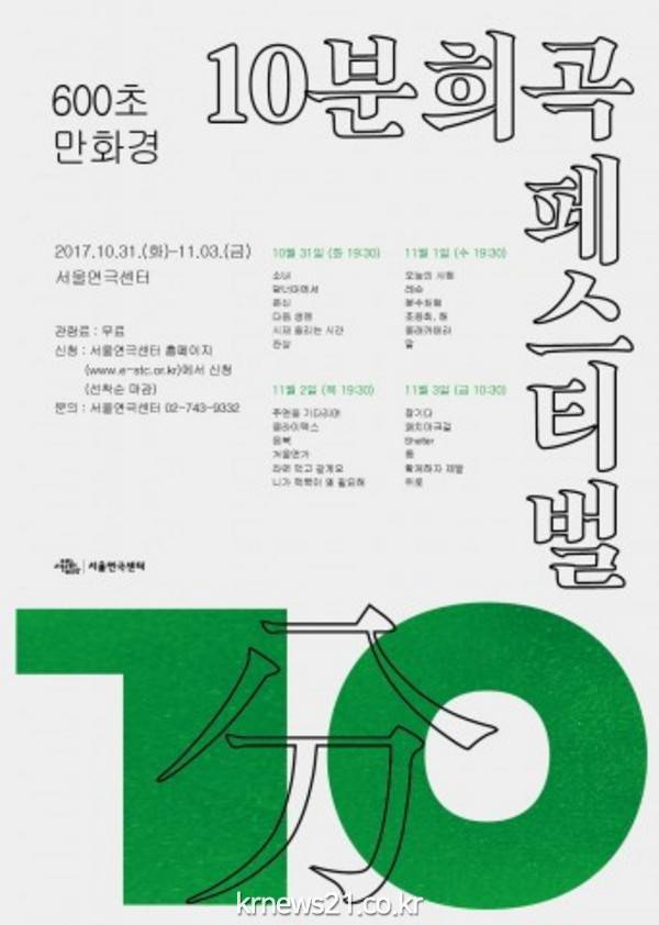 서울문화재단(대표이사 주철환) 서울연극센터가 신진 극작가들을 위한 희곡 축제 <10분희곡 페스티벌>을 31일(화)부터 11월 3일(금)까지 센터 1층에서 개최한다고 밝혔다.