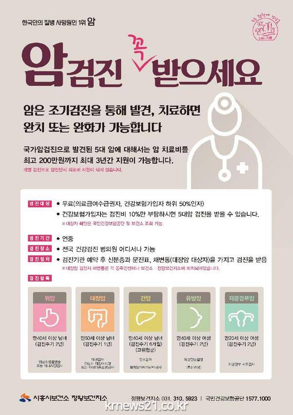 시흥시보건소(소장 안승철)는 2017년도 국가 암 검진 미수검자를 대상으로 연말까지 암 검진을 받을 것을 권유했다.