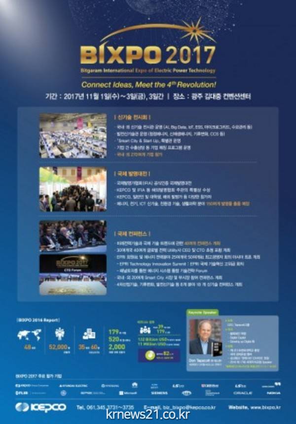 4차 산업혁명 시대를 선도할 신기술전시회는 BIXPO(빅스포) 2017이 열리는 11월 1일(수)부터 11월 3일(금)까지 오전 10시부터 오후 5시까지 김대중 컨벤션 1~3전시장에서 진행될 예정이다.