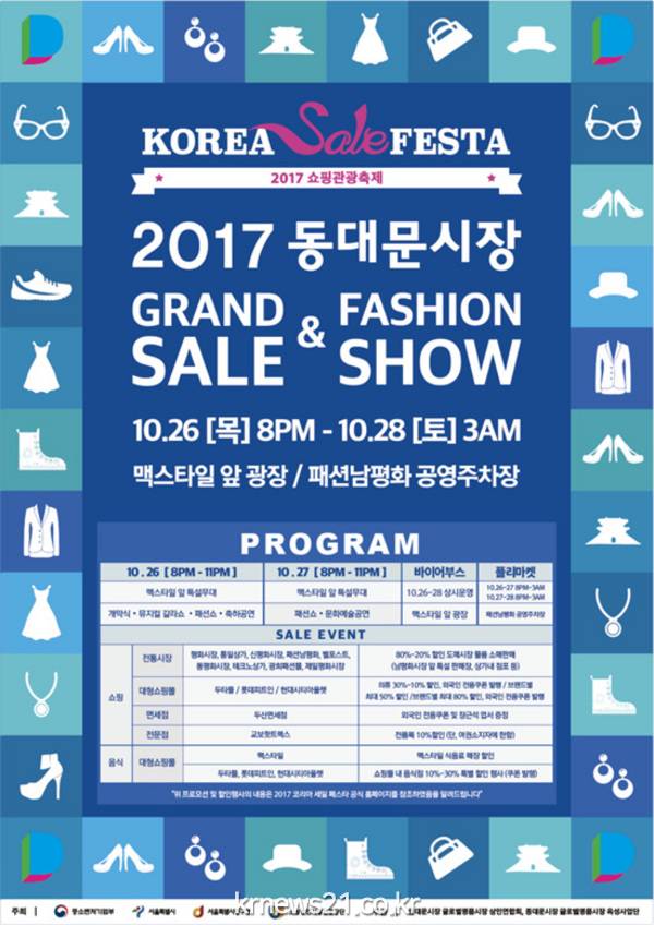 중구(구청장 최창식)와 동대문시장 글로벌 명품시장 육성사업단(단장 장상만)은 26일~28일 저녁7시부터 새벽3시까지 동대문시장 내 전통시장과 인근 대형쇼핑몰이 참여하는 '동대문시장 그랜드세일' 을 개최한다.