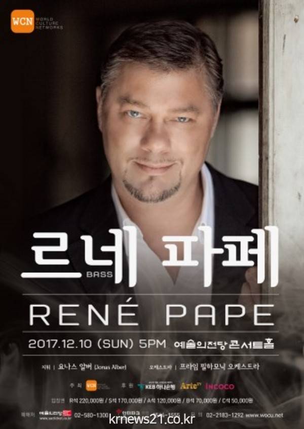 르네 파페는 12월 10일 오후 5시 예술의전당 콘서트홀에서 WCN 주최, 하나은행·아르떼TV·Incoco 후원, 프라임필하모닉오케스트라의 연주로 열릴 콘서트에서 한국 팬들에게 강렬한 음색 속 진중한 존재감을 보여줄 예정이다.