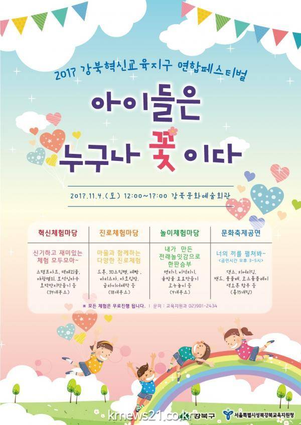 강북구(구청장 박겸수)가 오는 4일(토) 오후 12시부터 5시까지 강북문화예술회관에서 ‘아이들은 누구나 꽃이다’라는 표어를 내걸고 ‘2017 강북혁신교육지구 연합 페스티벌’을 개최한다.