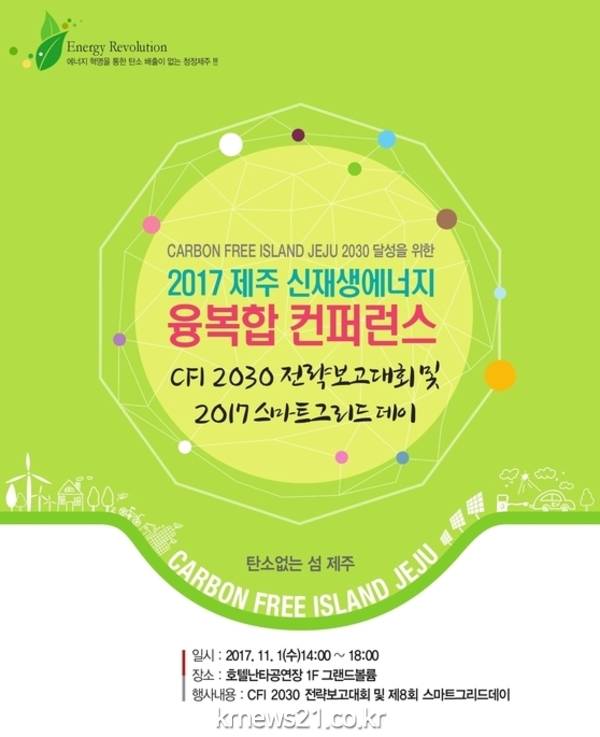제주특별자치도는 11월 1일 오후 2시 제주시 난타호텔에서 카본 프리 아일랜드 제주(Carbon Free Island Jeju) 2030 성공적 추진을 위한 '2017 제주 신재생에너지 융복합 컨퍼런스'를 개최한다.