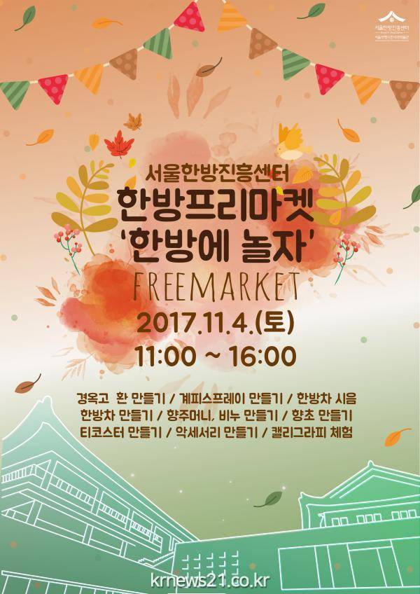 동대문구(구청장 유덕열)는 지난 10월 27일 개관한 서울약령시 서울한방진흥센터(동대문구 약령중앙로 26)에서 11월 4일(토) 오전 11시 한방프리마켓 ‘한방에 놀자’를 개최한다.