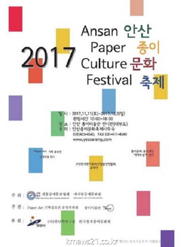 안산 대부도 종이미술관 전시장에서 열리는 안산종이문화축제는 공예품 전시, 학습하고 참여할 수 있는 체험 프로그램, 즐거운 볼거리를 제공할 공연이 마련돼 온 가족이 함께 어울리고 즐거움을 만끽할 수 있는 행사로 자리 잡아 매년 관람객들로부터 큰 호응을 이끌어내고 있다.