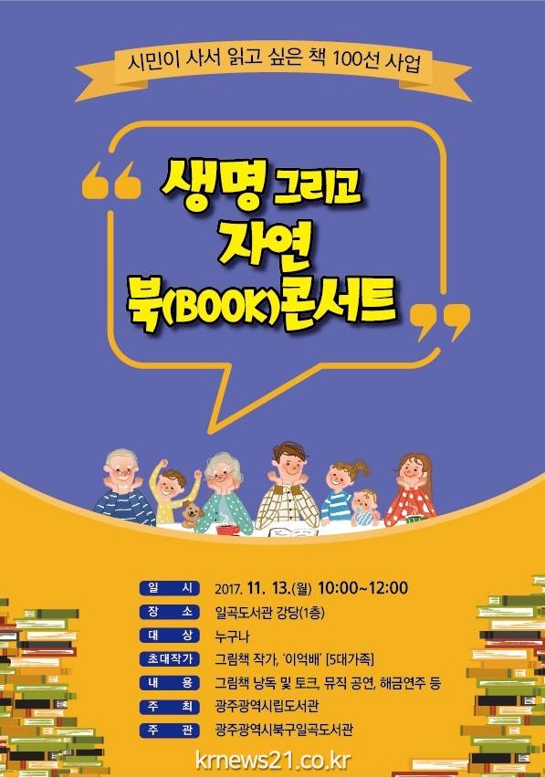 북구는 오는 13일 오전 10시부터 일곡도서관 강당 1층에서 그림책 ‘5대 가족’의 저자 이억배 작가를 초청해 ‘책과 음악이 있는 북 콘서트’를 개최한다고 9일 밝혔다.