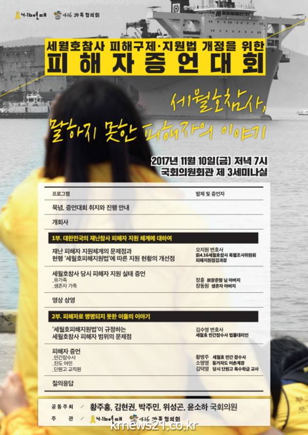 더불어민주당·국민의당·정의당 등 3당 국회의원 5인(황주홍-국민의당, 김현권-더불어민주당, 박주민-더불어민주당, 위성곤-더불어민주당, 윤소하-정의당)은 10일 오후 7시, 국회의원회관 제3세미나실에서 '세월호참사 피해구제·지원법 개정을 위한 피해자 증언대회'를 개최한다..