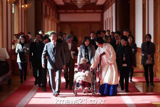 문 대통령은 김정숙 여사와 함께 현관 입구에 서서 할머니들을 맞이 했고, 청와대는 비서설 의전차량을 할머니들에게 제공하는 등 최고의 예우를 갖췄다고 청와대는 설명했다.