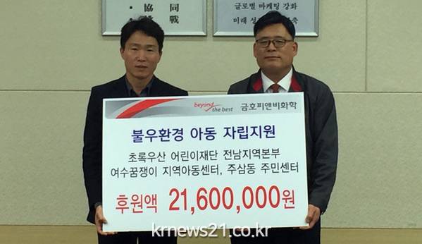 이날 금호피앤피화학은 주삼동 주민센터와 초록우산 어린이재단 전남지역본부, 여수꿈쟁이 지역아동센터에 총 2160만 원의 장학금을 지원했다.