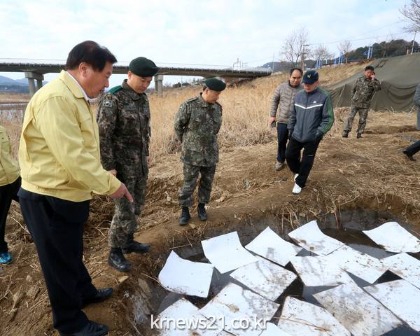 홍천군수는 3월 9일 오전에 화촌면 송정리 00부대의 유류 유출사고 현장을 방문하여 군 장병 등 방제작업 관계자를 격려하였다.
