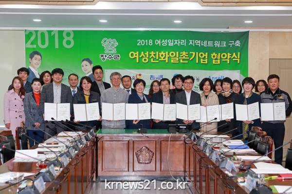 장수군은 13일 군청 회의실에서 관내 기업체 및 군 관계자 등이 참석한 가운데 전북광역여성새로일하기센터(센터장 이윤애) 주관으로 안셀코리아(주), ㈜피코바이오, ㈜신진에스엠, 동방제유, 장수수양원, ㈜바이오스톤, 농자재백화점 등 7개 업체와 여성친화일촌기업 협약을 체결하고 여성 친화적 일터 조성과 경력단절여성 채용으로 여성친화기업으로의 역할을 확대해 나가기로 했다.
