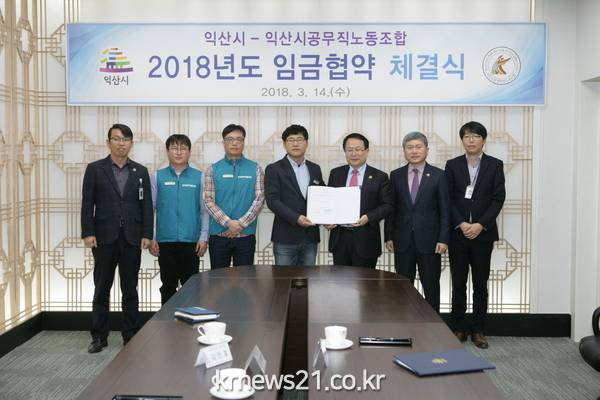 익산시(시장 정헌율)와 공무직노조는 지난 14일 정헌율 익산시장, 공무직노조 신동범 지부장을 비롯해 간부 공무원, 노조 임원진 등 10여 명이 참석한 가운데 2018년도 임금협약을 체결했다.