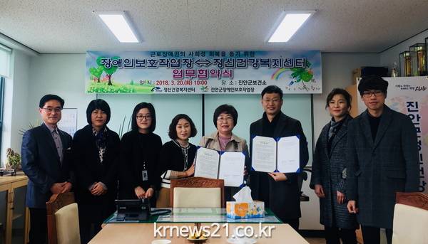 진안군 정신건강복지센터가 근로장애인 사회성 회복을 돕기 위해 장애인 보호작업장 ‘굿데이’와 20일 업무협약을 체결했다.