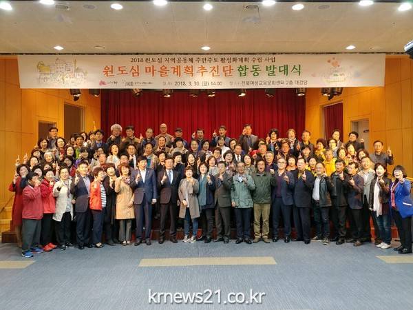 시와 전주도시혁신센터(센터장 김창환)는 30일 전북여성교육문화센터 2층 대강당에서 동서학동과 완산동, 풍남동, 노송동 등 원도심 9개동 마을계획추진단 200여명이 참석한 가운데 ‘2018년도 원도심 마을계획추진단 합동발대식’을 개최