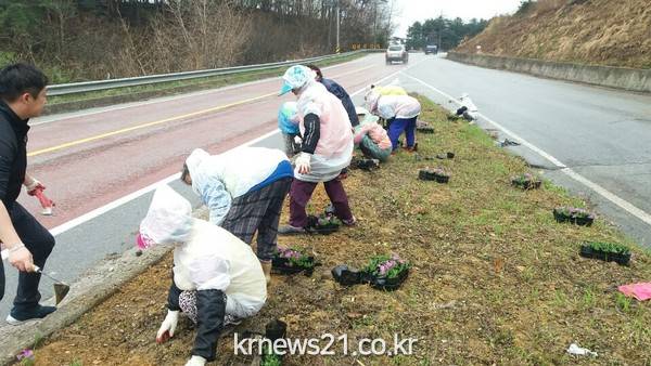 이번 조성사업에는 공공 근로자 및 직원과 함께 궂은 날씨에도 패츄니아 500본과 꽃잔디 500본 꽃묘를 도로변 화단 및 시가지 가로변에 식재하는데 구슬땀을 흘렸다.