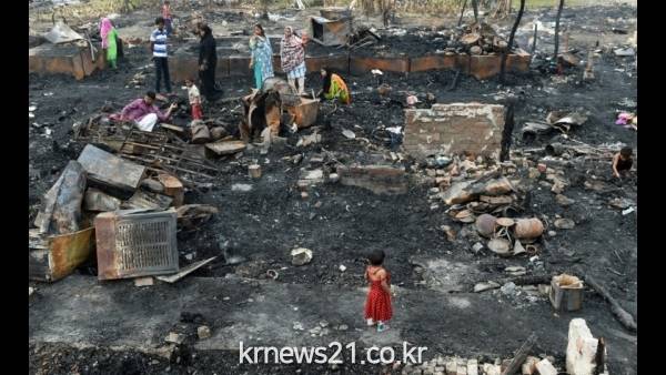 로힝야 피난민 200여 명이 모여있는 인도 뉴델리의 한 난민 캠프에서 화재가 발생한 후 남아있는 소지품을 찾고 있는 사람들.
