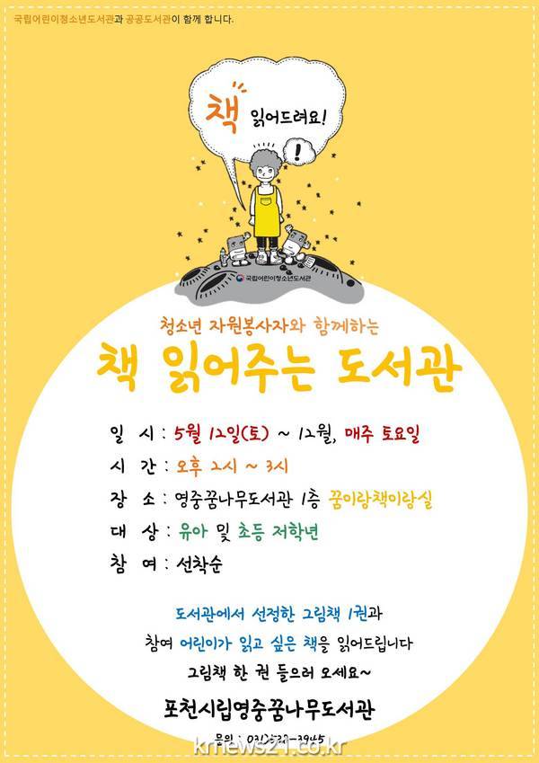 포천 영중꿈나무도서관에서는 주말 그림책 읽어주기 프로그램을 운영한다. 그동안 주말 그림책 읽어주기 프로그램이 없었던 영중도서관에서는 오는 5월부터 청소년 자원봉사자들의 지원으로 영유아들에게 책을 읽어주는 책 읽어주는 도서관 프로그램을 올해 처음 선보인다.