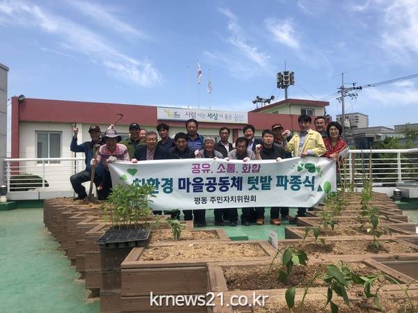 (뉴스21/장병기기자)=광주 광산구 평동 주민자치위원회(위원장 전동선) 회원들이,11일 이주노동자와 결혼이주여성을 돕는 드림센터 옥상의 ‘친환경 마을공동체 텃밭’을 정비하고, 화분 90개에 고추·가지·감자 씨앗 등을 심었다.