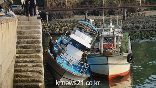 (전북/정진환 기자) 부안해양경찰서는 13일 전북 부안군 격포항내 개방형 회센터 앞 안벽에서 수중장애물에 걸려, 기울어지며 갑판이 침수된 S호(9.77톤, 변산선적, 연안자망, 승선원 없음)를 구조했다고 밝혔다.