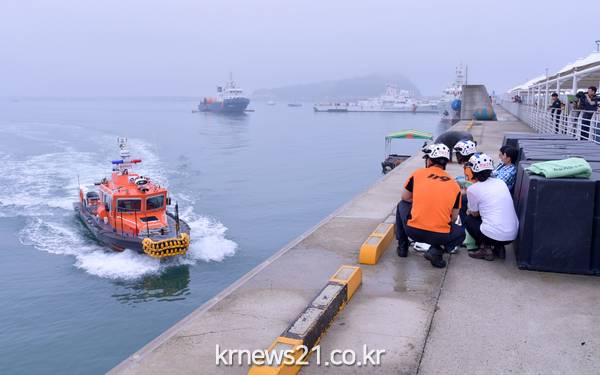 △지난 17일 오후 여수신항 해상에서 복합 해양재난 대비 정부합동훈련이실시되고 있다, 해양수산부와 전라남도, 여수시 등이 참여한 이번 훈련은 1단계 침수피해 주민대피, 2단계 육·해상 오염방제활동, 3단계 익수자 구조 등으로 진행됐다,