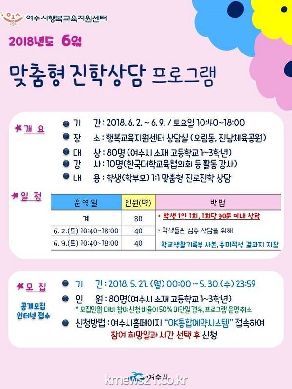 시에 따르면 다음달 2일과 9일 두 차례 여수시 행복교육지원센터에서 6월 진학상담