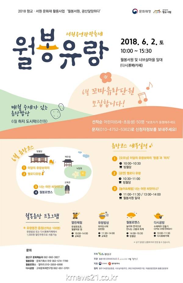 (뉴스21/장병기기자)=광산구(이성수 구청장 권한대행)가 서원공연관광축제인 ‘월봉유랑’ 6월 행사에 참여할 6세~초등학생 꼬마유랑단원 50명을 선착순 모집한다.