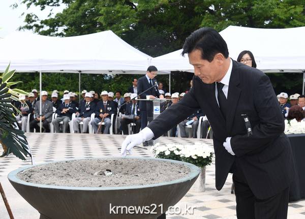 시에 따르면 제63회 현충일 추념식이 6일 오전 자산공원과 선원동 현충탑, 화장동 국