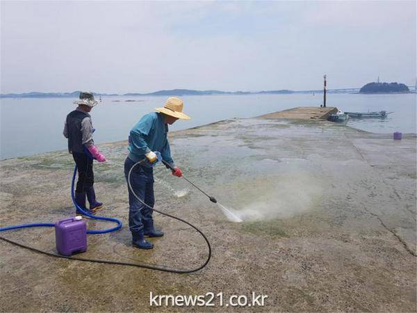 ▲ 원산도 선착장 파래및 이끼제거 작업 장면