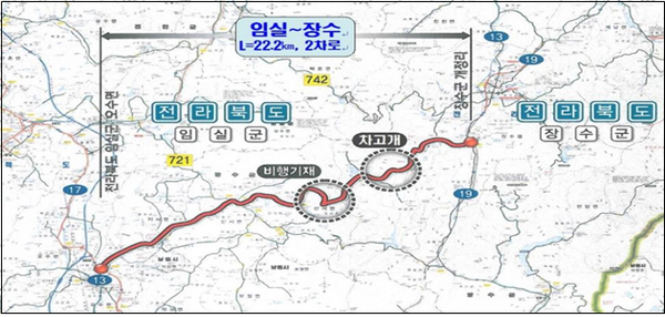 (전북/뉴스21) 정진환 기자 = 장수군 장수읍 개정리를 통과하는 국도 13호선 중 임실군 오수면 오수리까지 약 22.2km구간에 장수군의 숙원사업인「임실~장수 국도개량사업」을 추진할 계획이다.