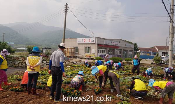 △지난 4일 여수 삼일동 주민들이 관내 빈터에 메리골드와 베고니아 등 여름꽃을 심고 있다. 이날 삼일동 새마을부녀회원과 통장, 공무원 등 50여명은 꽃밭 조성지 9곳에 여름꽃 8000여본을 심고 코스모스 꽃씨 5㎏을 뿌렸다