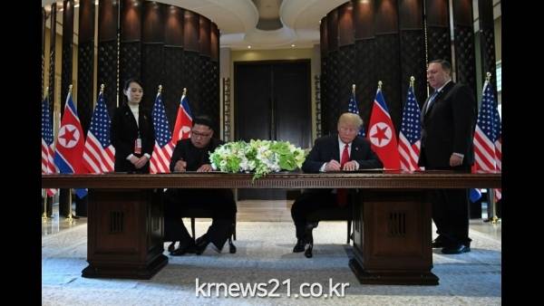 트럼프 대통령과 김 위원장은 이날 싱가포르 센토사 섬 카펠라 호텔에서 140여 분에 걸친 단독·확대정상회담과 업무오찬을 마친 뒤 역사적인 합의문을 채택, 서명식을 진행했다.