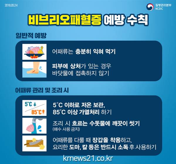 군 관계자는 “어패류를 충분히 익혀먹고, 피부에 상처가 있는 사람은 바닷물에 접촉하지 말아야 한다.”면서 “조리 시 바닷물에 씻지 말고 흐르는 수돗물에 깨끗이 씻고, 어패류를 요리한 도마·칼 등은 반드시 소독 후 사용해야 한다.”고 주의를 당부했다.