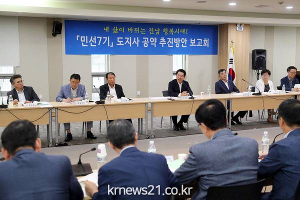 (뉴스21/장병기기자)=김영록 전남도지사 당선인의 ‘민선 7기 공약 추진 보고회’가 26일 전남개발공사 10층 회의실에서 열렸다.