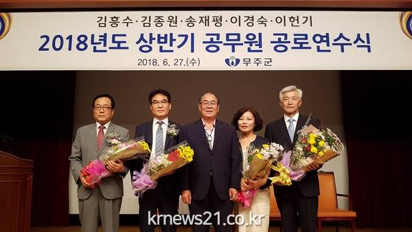 ▲ 2018년도 상반기 공무원 공로연수식(전북/뉴스21)송태규기자= 무주군은 지난 27일 전통문화의 집 대강당에서 2018년도 상반기 공무원 공로연수식을 가졌다. 황정수 군수를 비롯한 공무원과 대상자 등 2백여 명이 참석한 행사는 기획조정실 김흥수 실장(지방서기관)을 비롯한 안전재난과 김종원 민방위담당(지방행정 6급), 시설사업소 송재평 반디휴양담당(지방사회복지 6급), 구천진료소 이경숙 소장(지방보건진료 6급), 환경산림과 이헌기 주무관(지방운전 7급) 등 대상자에 대한 공로 및 감사패 수여, 꽃다발 증정, 기념촬영 등의 순으로 진행됐다.