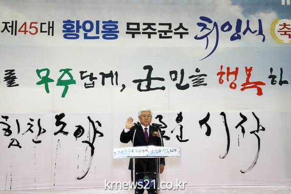 황인홍 군수는 취임사를 통해 “무주를 무주답게, 군민을 행복하게 만들기 위한 힘찬 걸음을 내딛기 위해 이 자리에 섰다”라며 “무주발전을 위해 여러분만 바라보고, 군민행복을 위해 여러분과 눈높이를 맞춰 사람과 자연, 농촌의 가치가 공존하는 품격 있는 무주를 만들겠다”라고 말했다.