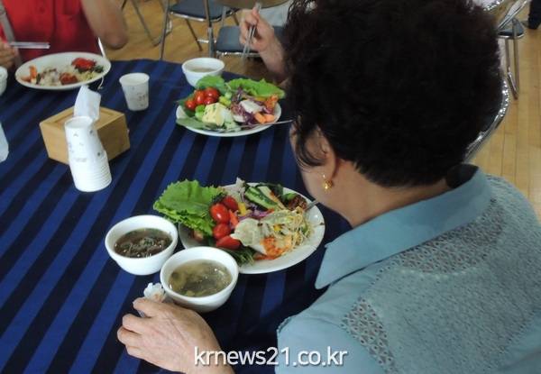 (뉴스21/장병기기자)=3일 광주 광산구 수완보건지소와 고혈압․당뇨병등록교육센터가 행복나루노인복지관에서 센터 등록 환자와 가족 50여명을 대상으로 저염시식회 ‘삼삼건강밥상’을 열었다.