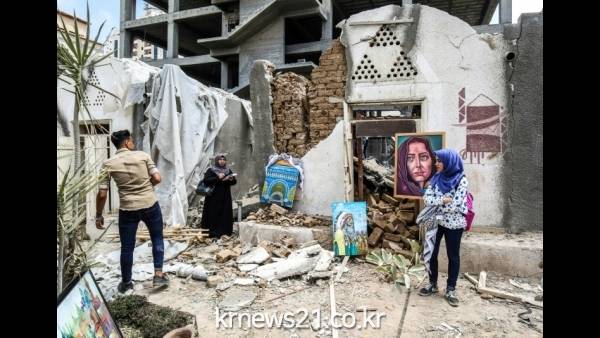 이틀 전 이스라엘의 공습으로 타격을 입은 가자지구에 팔레스타인 예술가들이 미술품을 전시하고 있다.