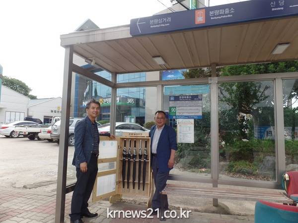 (뉴스21통신/광주)=17일 광주 광산구 본량동 행정복지센터가 마을경로당과 승강장에 ‘양심우산’을 비치하고, 주민에게 무료로 빌려주고 있다.