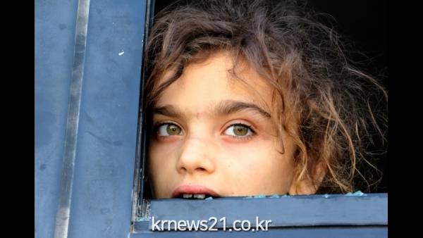 시리아 북부에서 수천명의 주민들이 대피하는 가운데 한 소녀가 부서진 버스 창문으로 밖을 바라보고 있다.